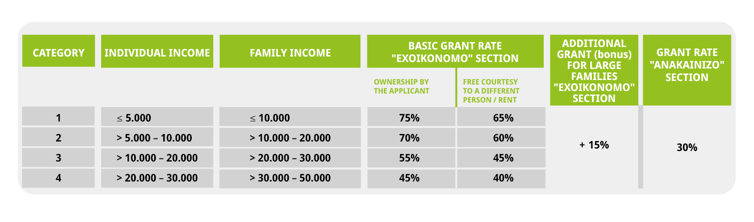 If the applicant has many children, an additional grant (bonus) of +15% is provided. In the “Anakainizo” section, the grant rate is fixed at 30% (income limit of €20,000 applies).”